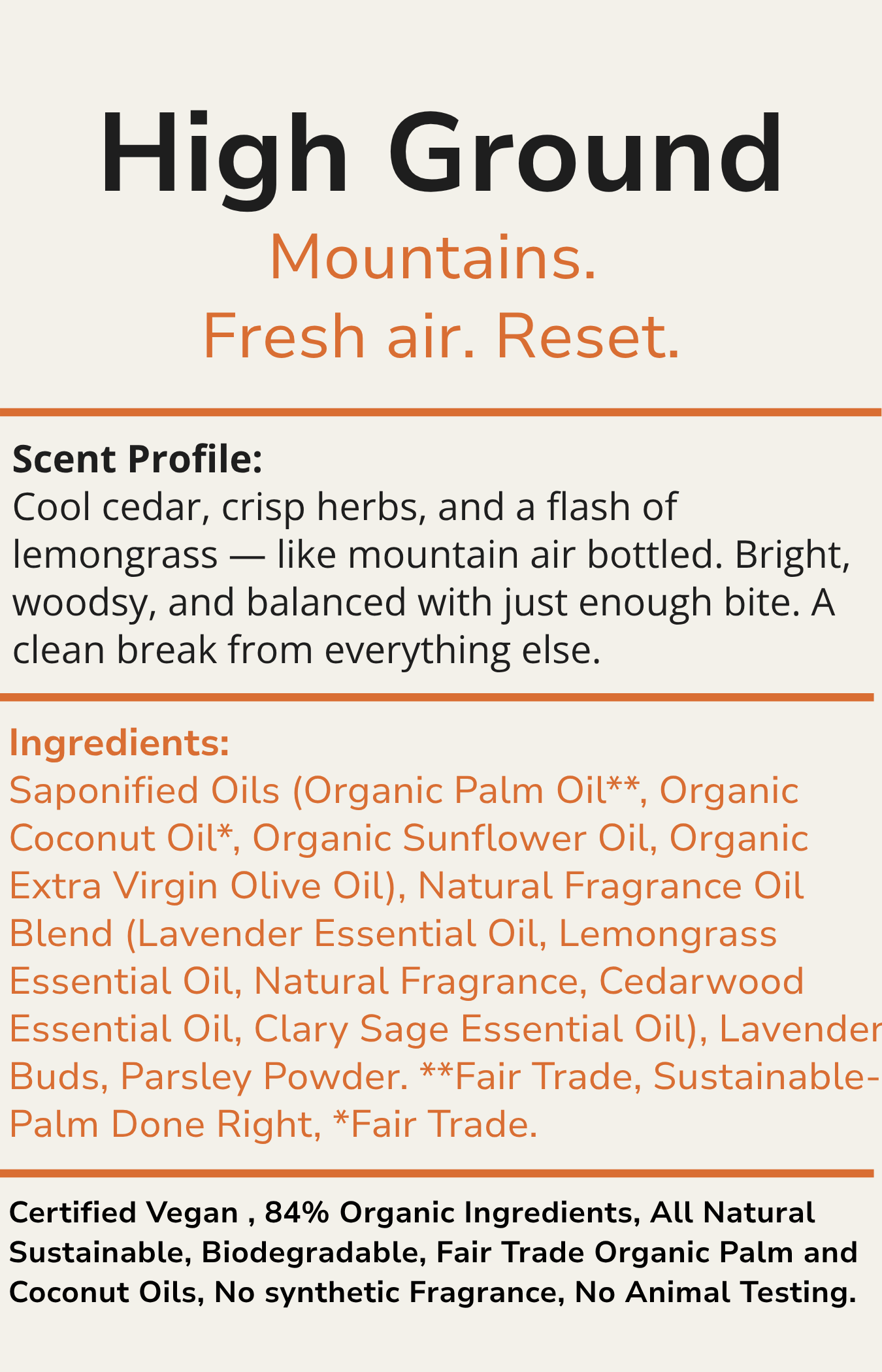 Saponified Oils (Organic Palm Oil**, Organic Coconut Oil*, Organic Sunflower Oil, Organic Extra Virgin Olive Oil), Natural Fragrance Oil Blend (Lavender Essential Oil, Lemongrass Essential Oil, Natural Fragrance, Cedarwood Essential Oil, Clary Sage Essential Oil), Lavender Buds, Parsley Powder. **Fair Trade, Sustainable-Palm Done Right, *Fair Trade.