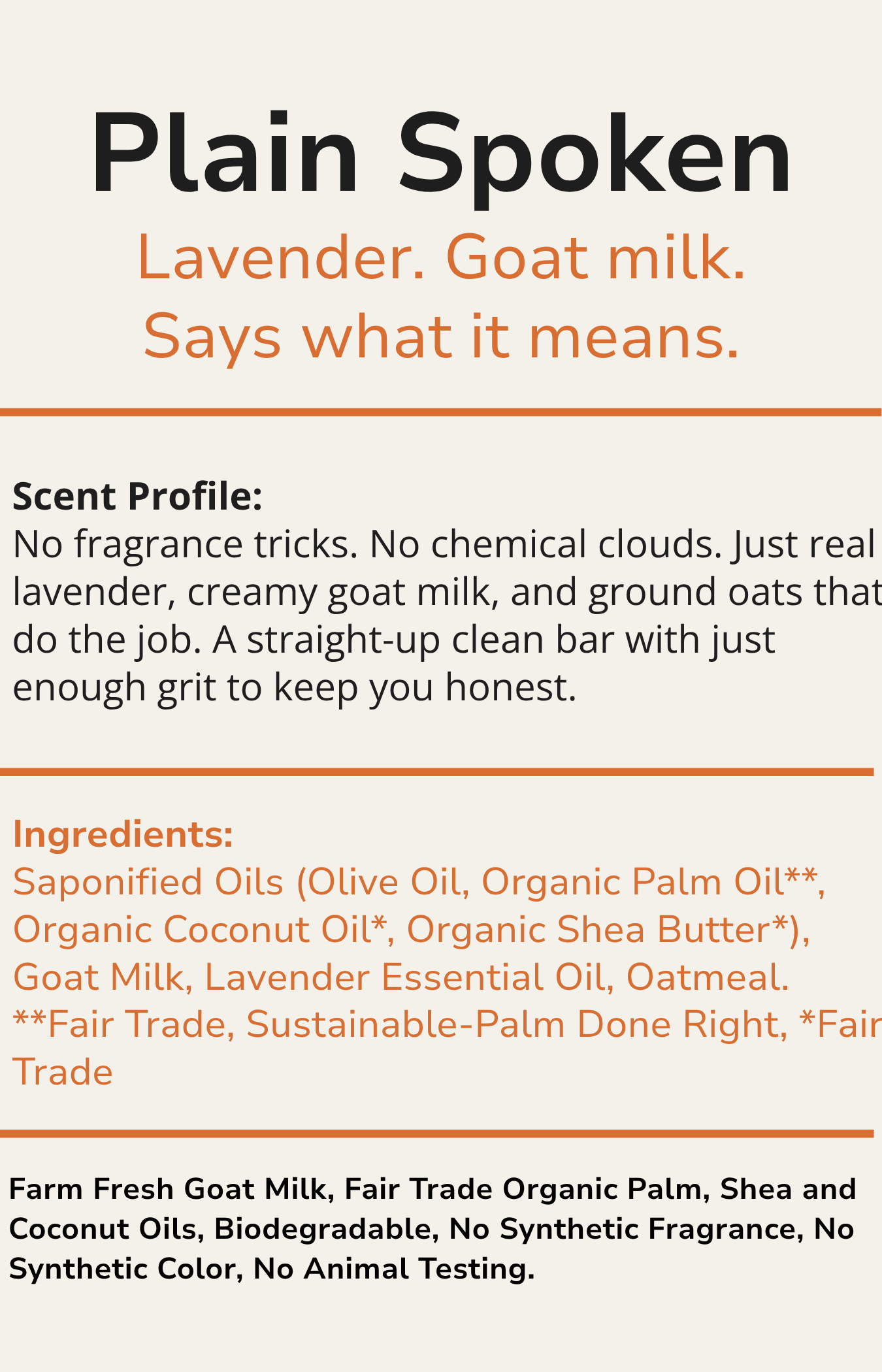 No fragrance tricks. No chemical clouds. Just real lavender, creamy goat milk, and ground oats that do the job. A straight-up clean bar with just enough grit to keep you honest.