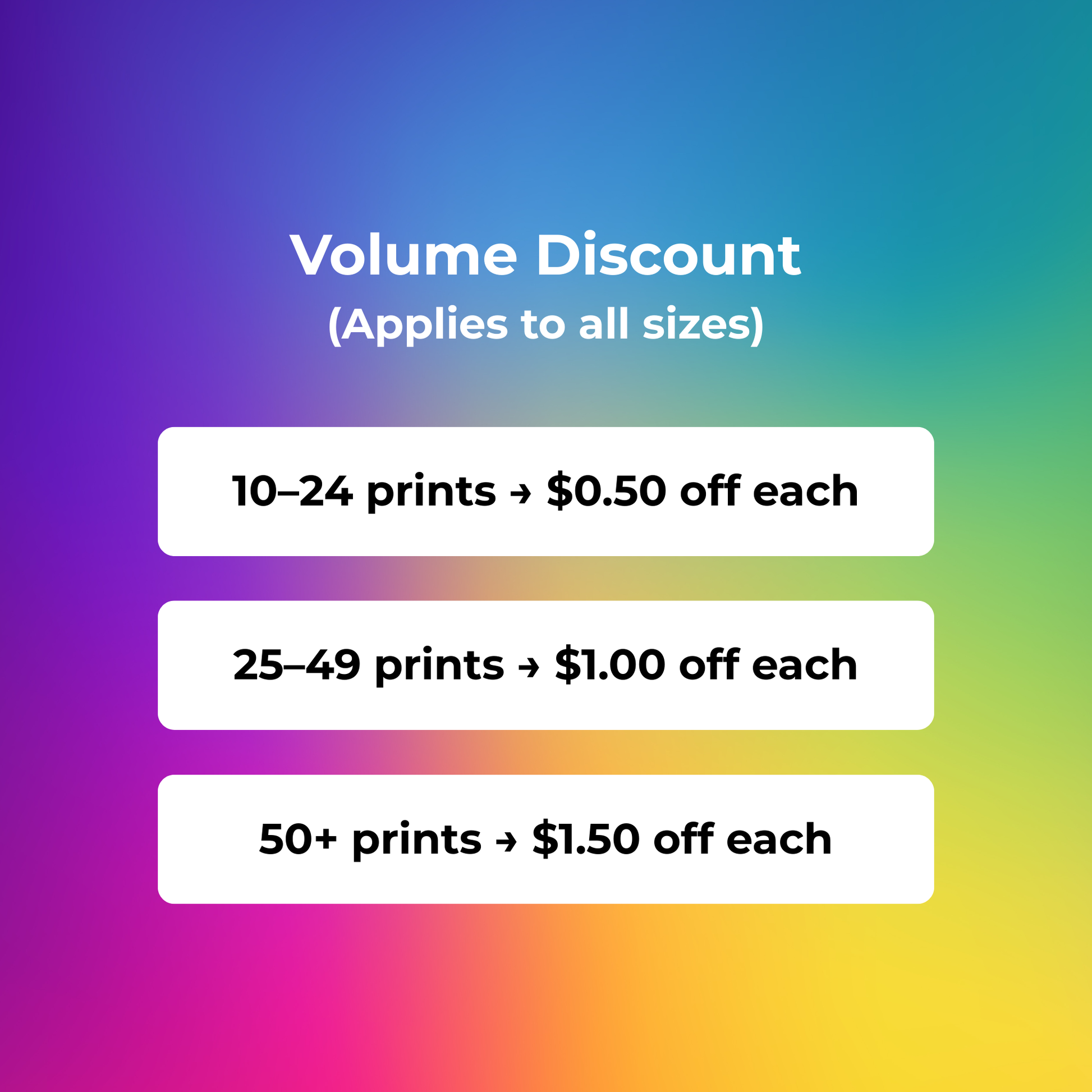 Max Width: 13″ (standard A3 width). Choose your tier by height; width can be anything up to 13″.