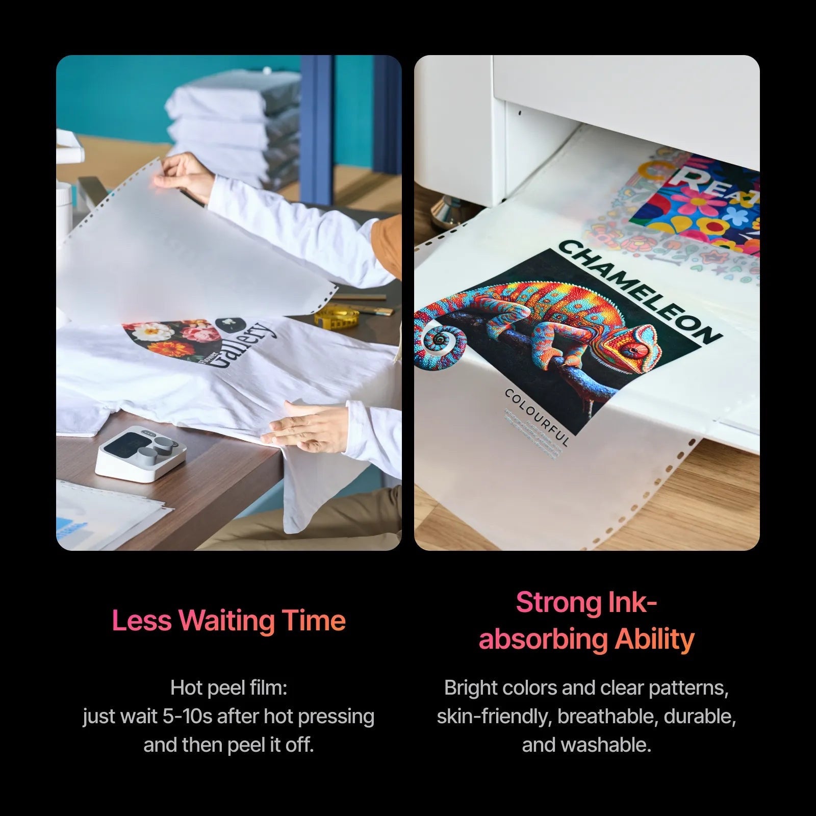 These settings are based on the hot-peel DTF film we use. Results may vary slightly depending on fabric weight, garment type, and your press, so always test before full production.