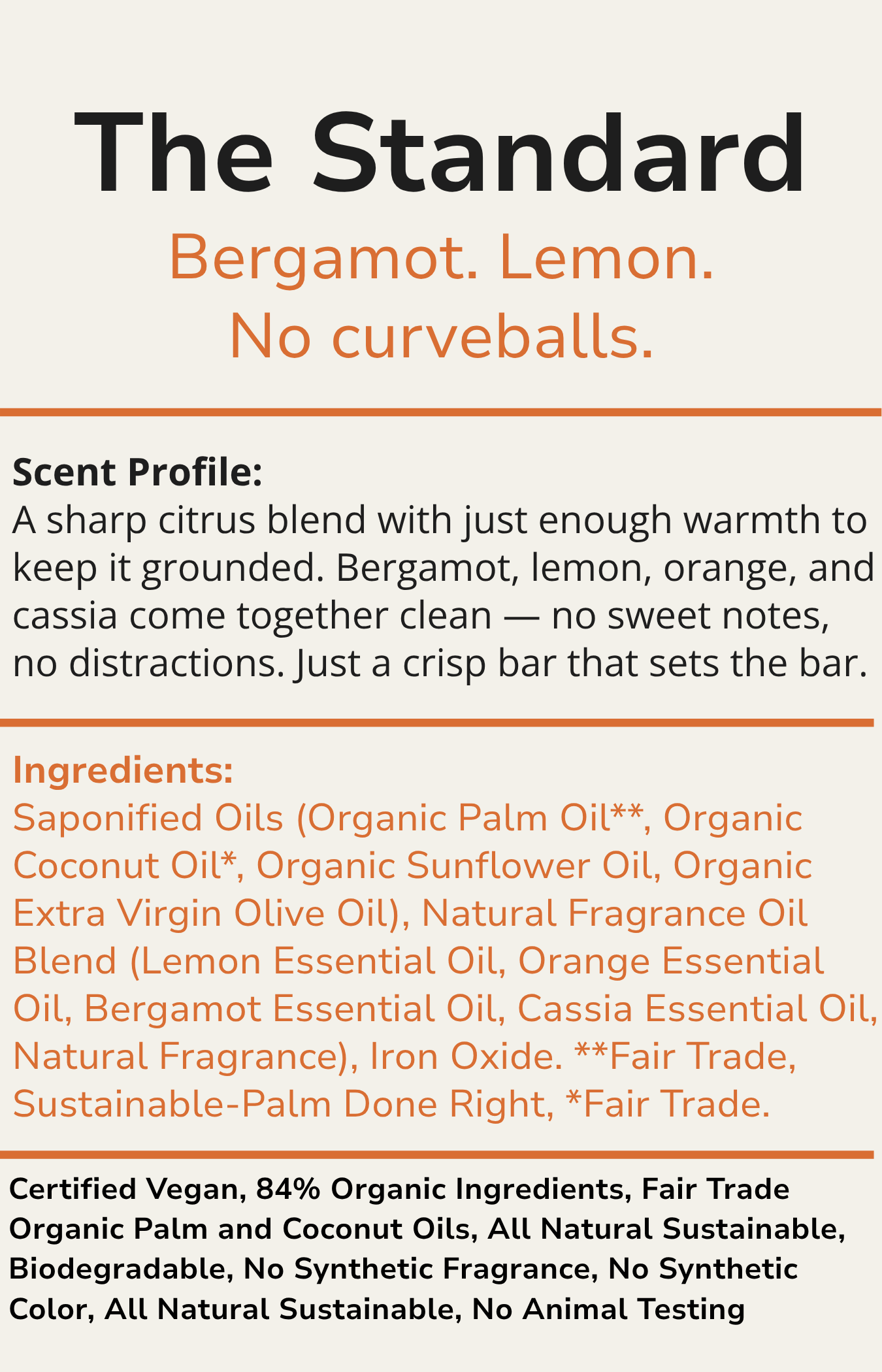 A sharp citrus blend with just enough warmth to keep it grounded. Bergamot, lemon, orange, and cassia come together clean — no sweet notes, no distractions. Just a crisp bar that sets the bar.