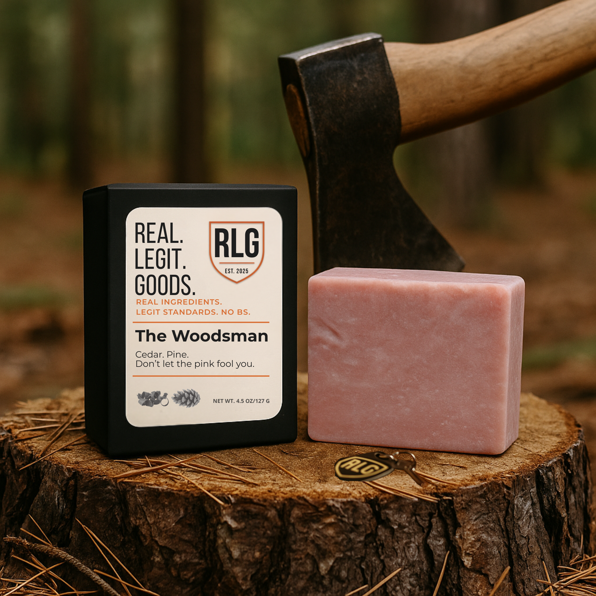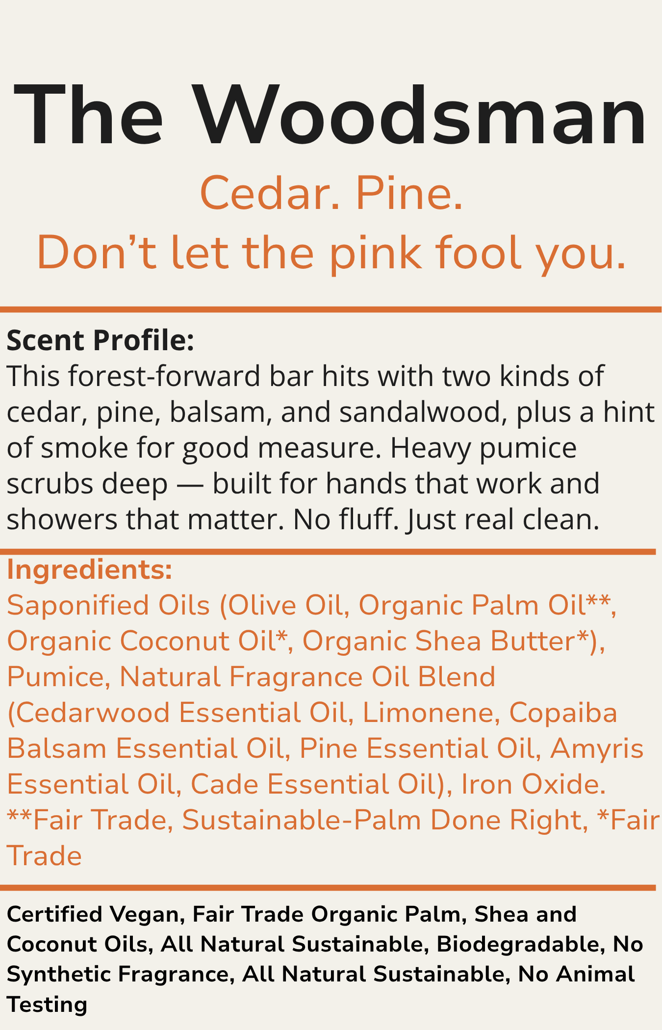 This forest-forward bar hits with two kinds of cedar, pine, balsam, and sandalwood, plus a hint of smoke for good measure. Heavy pumice scrubs deep — built for hands that work and showers that matter. No fluff. Just real clean.